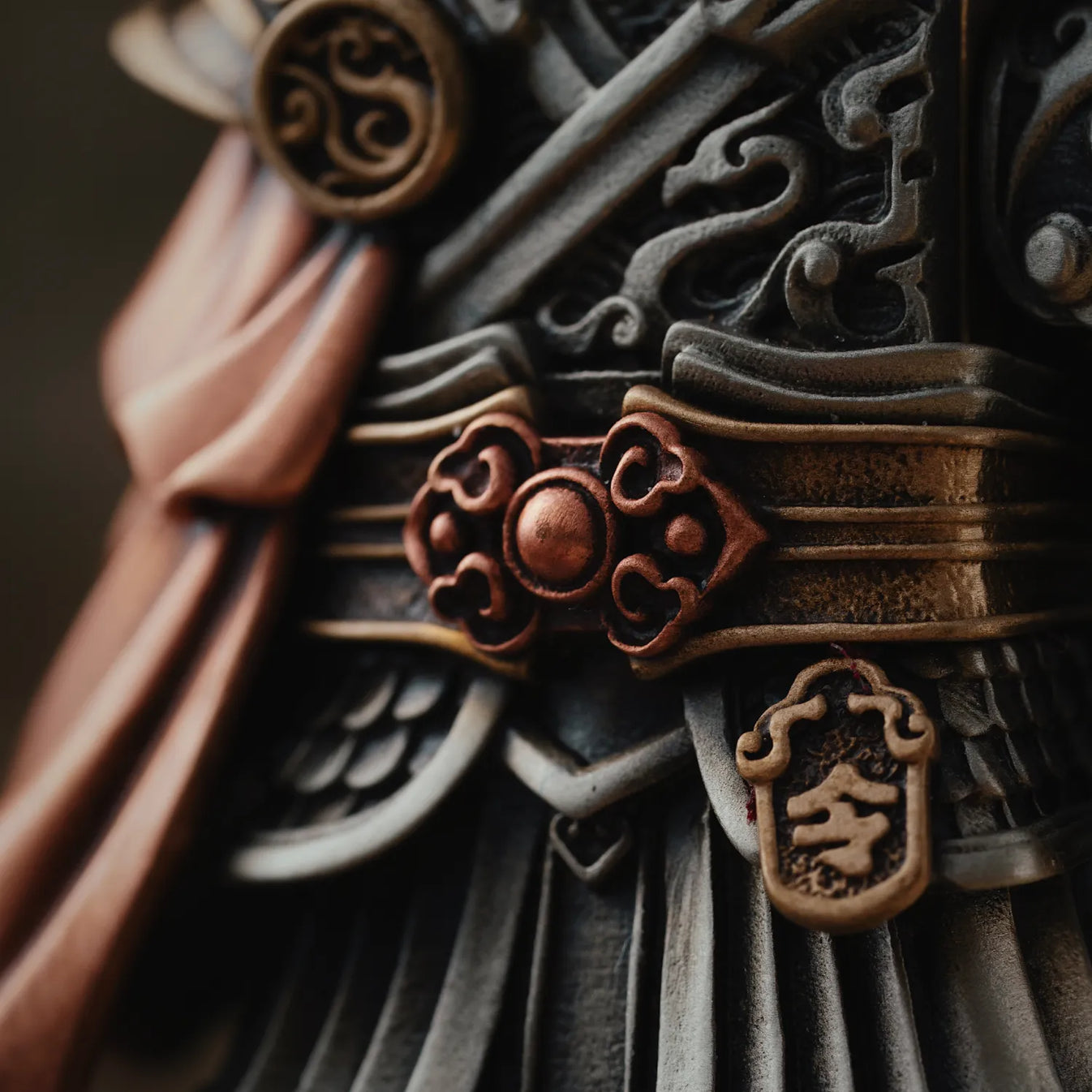 Unyielding beneath his domed helm, sash drawn tight, he measures distance in steps and decisions in heartbeats. His curved blade never trembles — formations advance when his hand tightens, and halt the instant it rests at his side.
